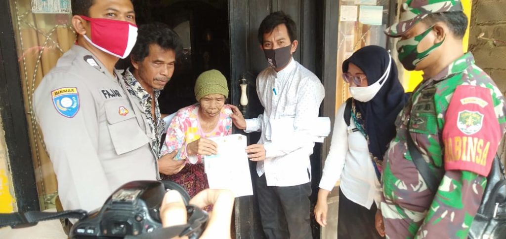 H.Suhada Kades Mekar Baru di dampingi Binamas dan Babinsa saat menyalurkan BLT-DD secara dor to dor.