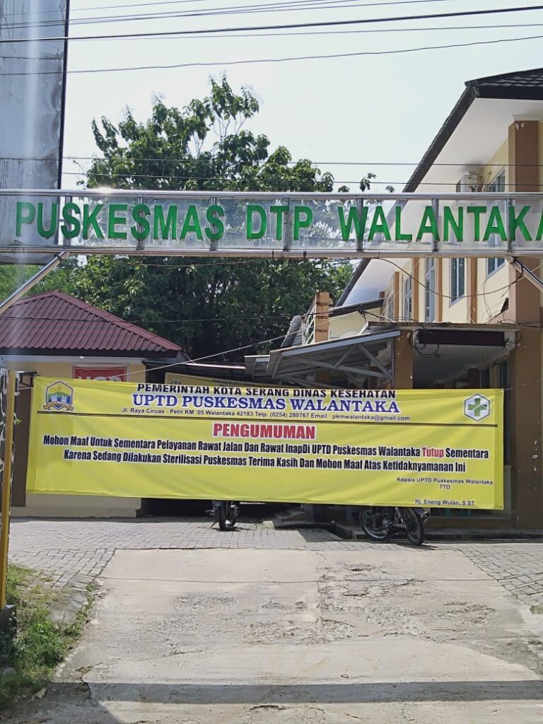 Saat ini pelayanan lagi para pasien rawat jalan dan inap di UPTD Puskesmas Kecamatan Walantaka, Kota Serang, Banten, secara resmi ditutup. Hal itu tertuang dalam tulisan salah satu Baliho yang ada di depan pintu gerbang Puskesmas Kecamatan Walantaka.