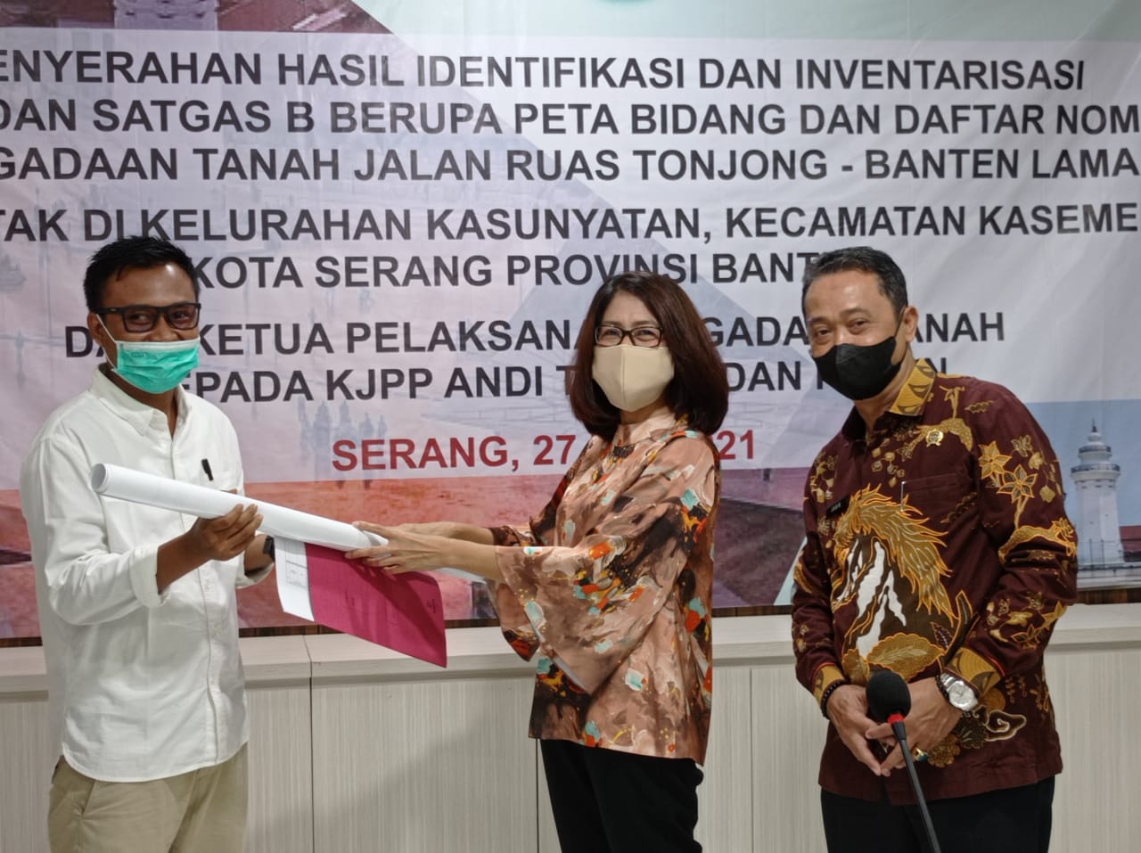 Setelah rampung lakukan Inventarisasi dan Identifikasi Satgas A dan Satgas B objek kegiatan Pengadaan Tanah Jalan Ruas Tonjong – Banten Lama, hasil inventarisasi dan identifikasi yang berupa Peta Bidang Tanah dan Daftar Nominatif sebanyak 43 bidang diserahkan langsung oleh Andi Tenri Abeng selaku Ketua Pelaksana ke Kantor Jasa Penilai Publik (KJPP) Andi Tiffani dan Rekan selaku Penilai tanah yang ditunjuk oleh Dinas Pekerjaan Umum Perumahan Rakyat (PUPR) Provinsi Banten dan yang ditetapkan oleh Kantor Wilayah Badan Pertanahan Nasional Provinsi Banten pada Kamis (27/5) pagi ini bertempat di Ruang Rapat Baduy Kantor Wilayah BPN Provinsi Banten.