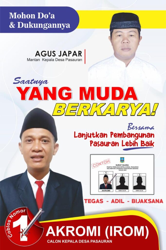 Calon Kepala Desa Pasauran, Kecamatan Cinangka, Kabupaten Serang, Banten, Akromi, yang akrab disapa Irom, ini akan berkarya dalam pembangunan desa jika ia terpilih sebagai Kades Pasauran periode 2021-2026 yang akan datang.