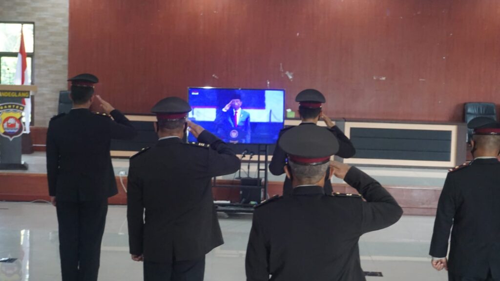 Kapolres Pandeglang, AKBP Belny Warlansyah, dan PJU Polres Pandeglang, mengikuti Upacara Hari Kesaktian Pancasila 1 Oktober 2021. Diikuti secara virtual di Aula Tingang Menteng Pananjung Tarung Mako Polres Pandeglang, Jumat (1/10/2021).