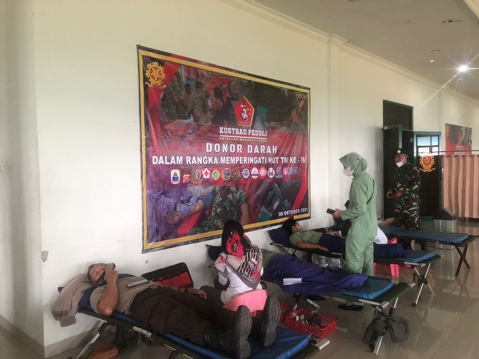 Sinergitas TNI/Polri, personil Polres Lebak, Polda Banten, mengikuti giat donor darah dalam rangka memperingati HUT TNI ke-76 di Batalyon Mandala Yudha Jl. Raya Cipanas Km.17 Desa Mekarsari, Kecamatan Sajira, Kabupaten Lebak, Provinsi Banten. Rabu (6/10/2021)