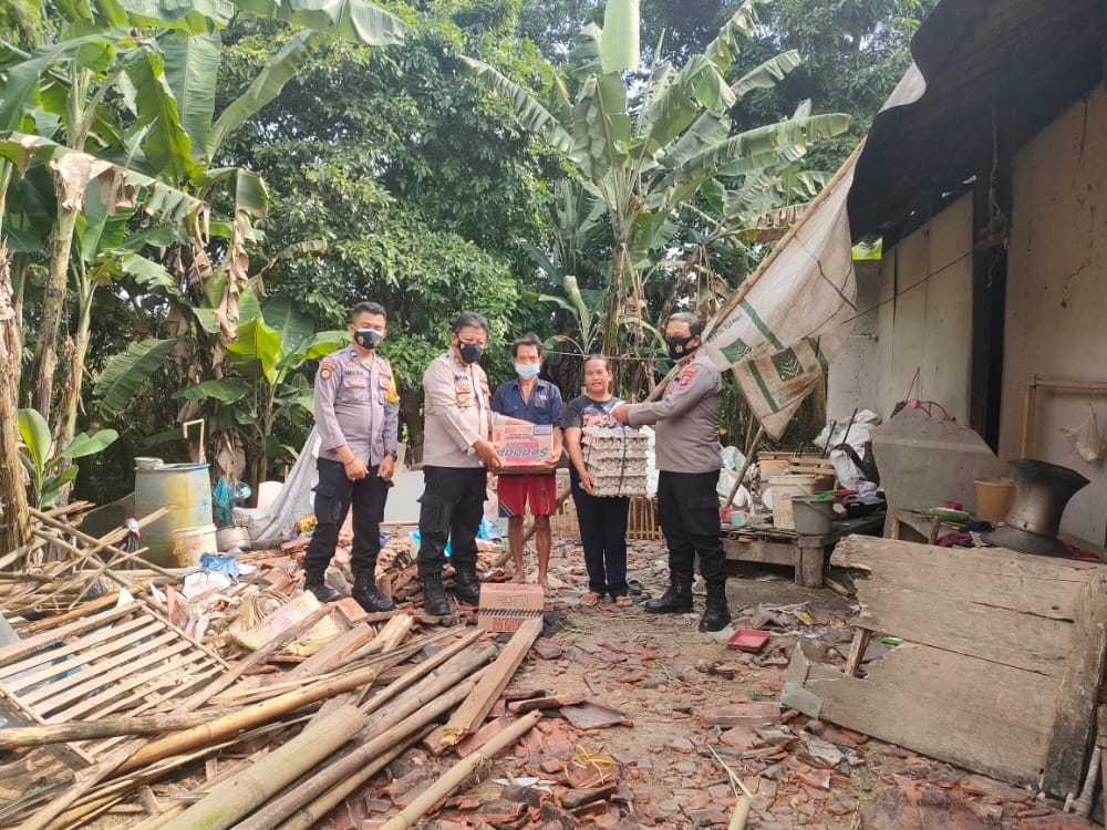Kapolsek Pamarayan, Polres Serang, AKP Muljadi, SH, didampingi Wakapolsek, IPTU Teguh Yuni dan Bhabinkamtibmas BRIPTU M. Akhyani, memberikan bantuan Sembako kepada warga yang rumahnya rusak. Hal itu akibat cuaca ekstrem hujan disertai angin besar di Kampung Nusa,vDesa Malabar, Kecamatan Bandung, Kabupaten Serang, Banten, Senin (8/11/2021).