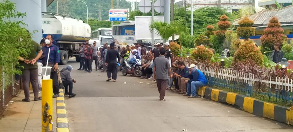 Puluhan Pengurus Truck (Petruk) di Area Pelabuhan Angkutan Sungai, Danau dan Penyeberangan (ASDP) Cabang Merak, Kota Cilegon, melakukan protes di depan pintu masuk Pelabuhan, pada Jum’at (12/11/2021).