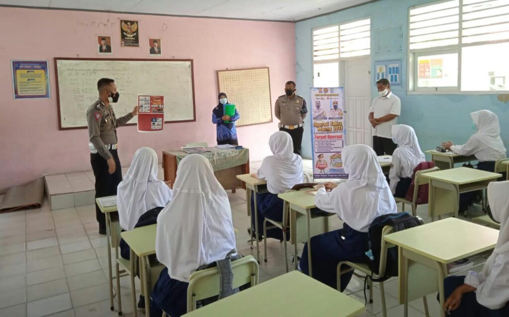 Secara serentak seluruh Indonesia, Operasi Zebra Maung 2021 kembali dilaksanakan mulai Senin 15 hingga 28 November 2021. Anggota Sat Lantas Polres Serang, Bripka Fajar Agung Wahyudi dan Brigpol Puji, mendatangi SMPN 1 Ciruas, Kecamatan Ciruas, Kabupaten Serang, untuk memberikan penyuluhan, pada Rabu (17/11/2021).