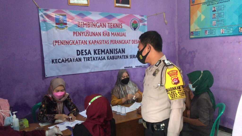 Pengamanan vaksinasi di Kantor Desa Kemanisan, Kecamatan Tirtayasa dilakukan oleh Anggota Polsek Tirtayasa, Polres Serang, untuk masyarakat Desa Kemanisan dan Sekitarnya bertempat di Kantor Desa Kemanisan, Kecamatan Tirtayasa, Kabupaten Serang, Sabtu (20/11/2021) pukul 09.00 WIB.