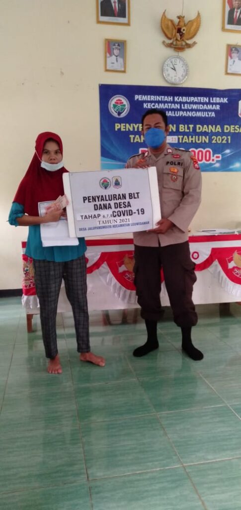 Bhabinkamtibmas, Brigadir Kasnadi, melaksanakan pendampingan penyaluran Bantuan Langsung Tunai (BLT) tahap 10 dan 11 dari Dana Desa Tahun 2021 di Balai Desa Jalupangmulya, Kecamatan Leuwidamar, Kabupaten Lebak, pada Senin (22/11/2021).