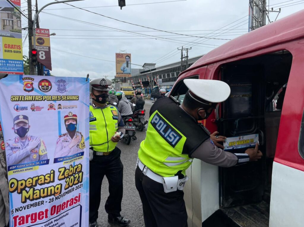 Dalam rangka meningkatkan disiplin masyarakat pengendara motor, Satlantas Polres Serang, melaksanakan Operasi Zebra Maung 2021, hari ke sembilan di lampu merah Ciruas, pada Senin, (22/11/2021).