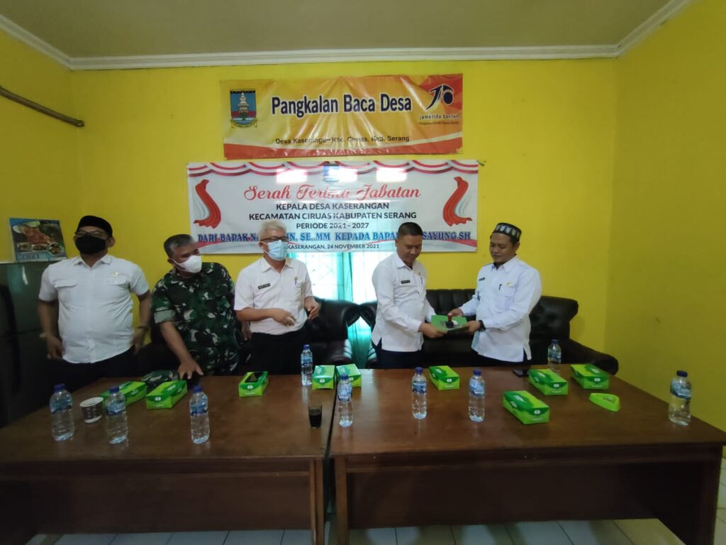Kapolsek Ciruas, AKP Syarif Hidayat, diwakili Bripka Hendra Marjuki, menghadiri acara serah terima jabatan Pejabat Sementa (Pjs) Kepala Desa Kaserangan kepada Kepala Desa Terpilih, Edi Sayung, periode 2021-2027.