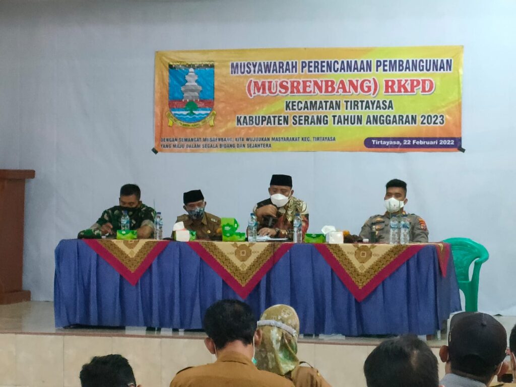 Pemerintah Kecamatan Tirtayasa, Kabupaten Serang, Banten, menggelar kegiatan Musyawarah Perencanaan Pembangunan (Musrenbang) untuk RKPD Tahun 2023 dengan usulan sebanyak 50 kegiatan diantaranya, peningkatan infrastruktur, ekonomi, pendidikan kesehatan dan pemberdayaan pasca pandemi Covid-19. Kegiatan itu bertempat di Aula Gedung PGRI Kecamatan Tirtayasa, Kabupaten Serang, pada Selasa (22/02/2022).