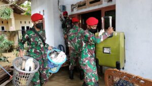 Grup 1 Kopassus kembali tanggap bencana banjir dan berjibaku guna membantu meringankan beban masyarakat yang ada di Kawasan Kecamatan Kasemen, Kota Serang, pada Rabu (2/3/2022).