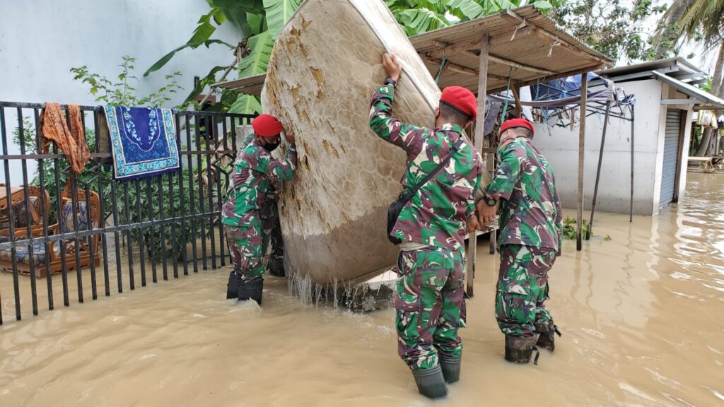 Grup 1 Kopassus kembali tanggap bencana banjir dan berjibaku guna membantu meringankan beban masyarakat yang ada di Kawasan Kecamatan Kasemen, Kota Serang, pada Rabu (2/3/2022).