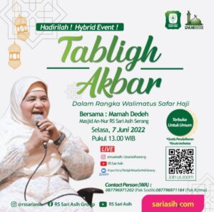 Humas RS Sari Asih Kota Serang, Agus Ramdani, SE, ketika dihubungi Harianexpose.com menjelaskan, pengurus DKM Masjid An- Nur RS Sari Asih, dalam rangka walimatussafar, mengadakan Tabligh Akbar dengan mengundang penceramah yang sudah tak asing yakni, Mamah Dedeh.