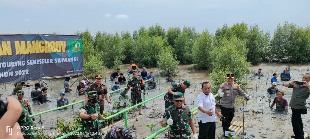 Sejalan dengan pencanangan pelestarian lingkungan oleh Presiden RI, Joko Widodo, pada saat Peresmian Persemaian Rumpin di Kabupaten Bogor, Jum’at (10/6/2022) yang lalu, Sail and Touring Sekeseler Siliwangi menggelar gebyar penanaman pohon Mangrove di setiap pesisir pantai wilayah Kodim yang disinggahi. Salah satunya penanaman pohon Mangrove di pesisir pantai Karangantu, Kelurahan Banten, Kecamatan Kasemen, Kota Serang, dipimpin langsung Danrem 064/MY, Brigjen TNI Yunianto.