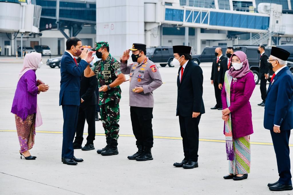 Pj, Gubernur Banten, Al Muktabar nampak bersama pengantar lainnya mendampingi Presiden Jokowi memberikan keterangan pers. Demikian pula saat Presiden Jokowi hendak menaiki tangga pesawat.