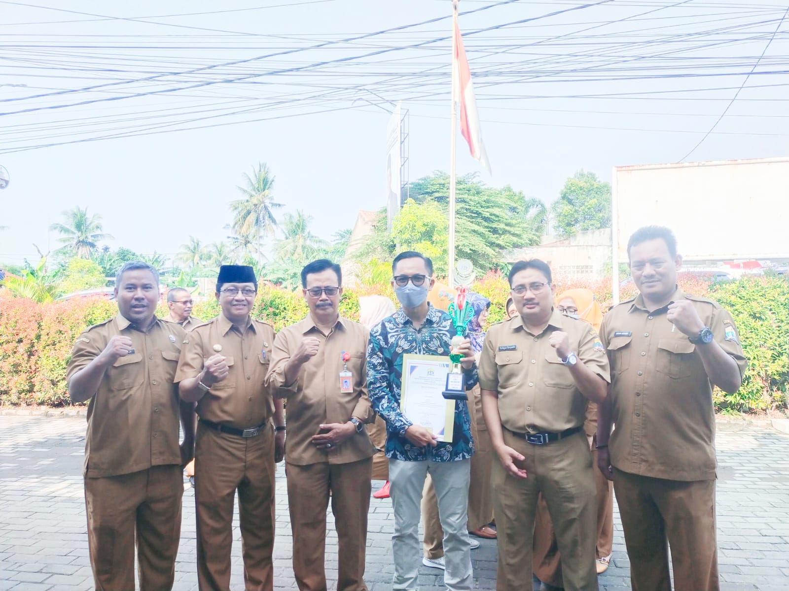 Kepala SD AGIS Kota Serang Abdurahman, SE, sedang memegang piala dan piagam, foto bersama dengan Kadis Dikbud Kota Serang, Dr. Alpedi, M.Pd, Sekdis Dikbud Kota Serang H. Agus, S.Pd, M.Si, Ketua FKGS, Drs. Badrudin, Kabid SD Dikbud Kota Serang, Drs. Yayan dan Kasi SD Dikbud Kota Serang. (Foto : Istimewa).