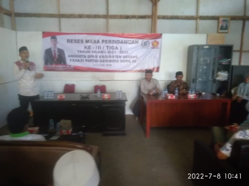 Ketua Komisi 2 Fraksi Gerindra DPRD Kabupaten Serang, H. Suja’i A. Sayuti, SH, MM, menggelar Reses di Desa Curuggoong, Kecamatan Padarincang, Kabupaten Serang, pada Jum’at (8/7/22).