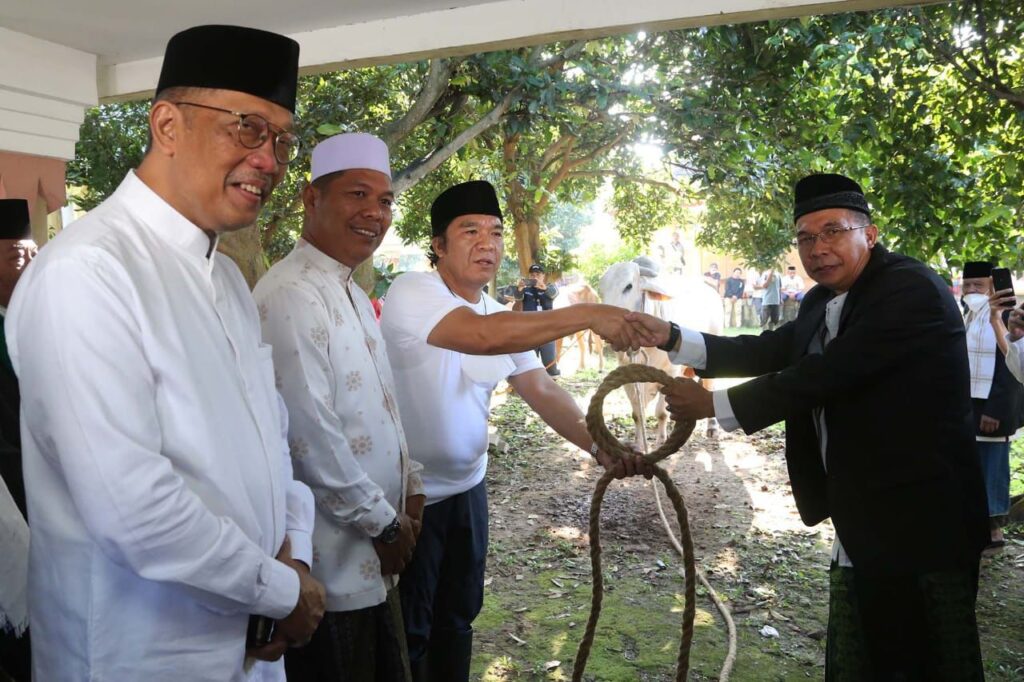 Penjabat Gubernur Banten, Al Muktabar memotong 10 hewan kurban di Masjid Raya Al Bantani KP3B Curug, Kota Serang, pada Minggu (10/7/2022). Salah satunya sapi hewan kurban sumbangan Presiden Joko Widodo (Jokowi). Al Muktabar menyembelih 8 ekor sapi dan 2 ekor kerbau. Dalam hal pemotongan hewan, Al Muktabar telah memiliki sertifikat Juru Penyembelihan Halal (Juleha).