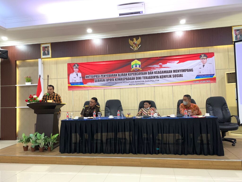 Badan Kesatuan Bangsa dan Politik (Kesbangpol) Kota Serang, menyelenggarakan sosialisasi penyebaran aliran kepercayaan dan keagamaan menyimpang sebagai upaya kewaspadaan dini terjadinya konflik sosial. Kegiatan itu bertempat di Hotel Wisata Baru, Kota Serang, Banten, pada Kamis (28/7/2022).