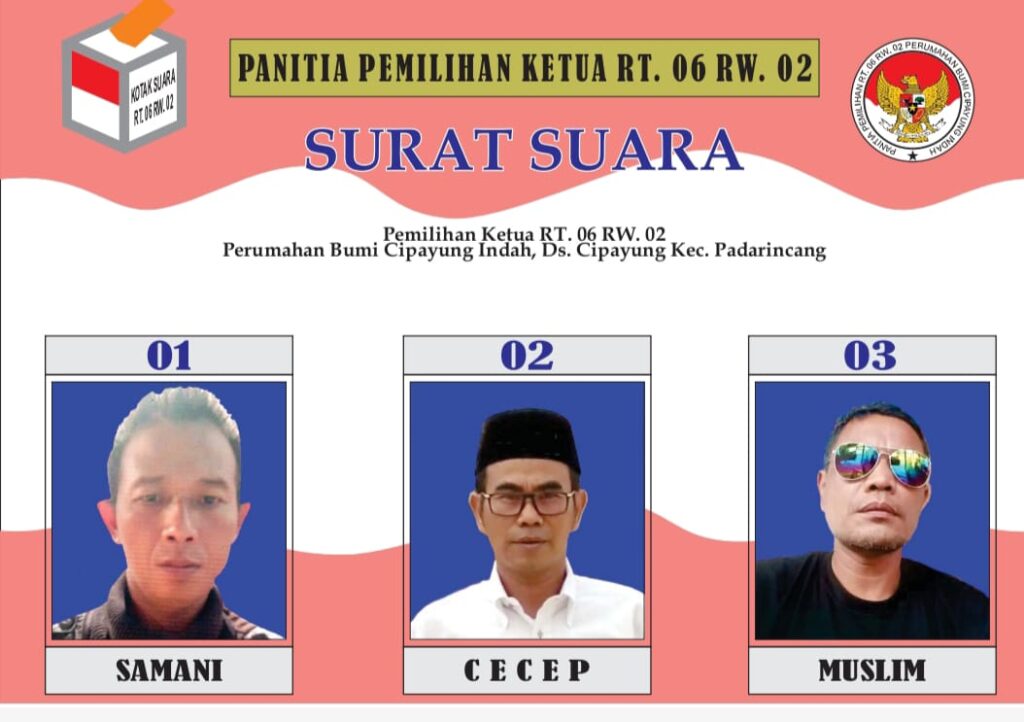 Pemilihan Ketua RT.06 / RW.02 Perumahan Bumi Cipayung Indah, Desa Cipayung, Kecamatan Padarincang, Kabupaten Serang, mengadakan pemilihan seperti layaknya Pemilihan Umun (Pemilu) atau Pemilihan Kepala Daerah (Pilkada) secara demokratis, Minggu (28/8/2022).