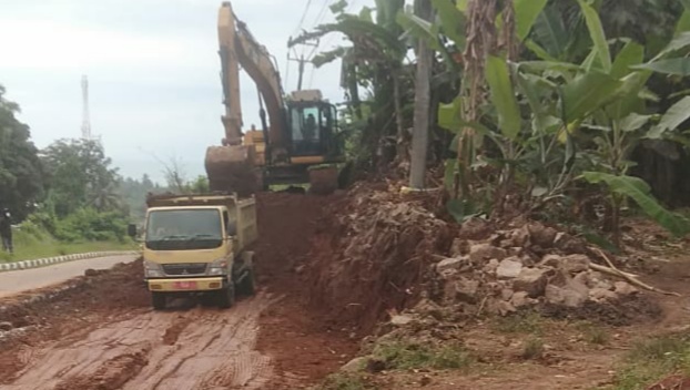 Kendaraan truck pengangkut material tanah merah milik Dinas Pekerjaan Umum (DPU) Provinsi Banten. Tampak dengan menggunakan kendaraan alat berat (ekssavator) guna meratakan dan mengeruk gundukan tanah yang menggunung di sisi Jalan Raya Palka tepatnya di Kp Parigi, Desa Cinangka, Kecamatan Cinangka, Kabupaten Serang, Banten.