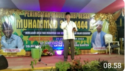 Camat Anyar, Kabupaten Serang, H. Imron Ruhyadi. S.STP.M.Si, menghadiri acara Peringatan Maulid Nabi Besar Muhammad SAW. Acara itu digelar warga Kampung Simpang Tiga, Desa Mekar Sari. Kecamatan Anyar, Kabupaten Serang, Banten, pada Sabtu (22/10/2022).