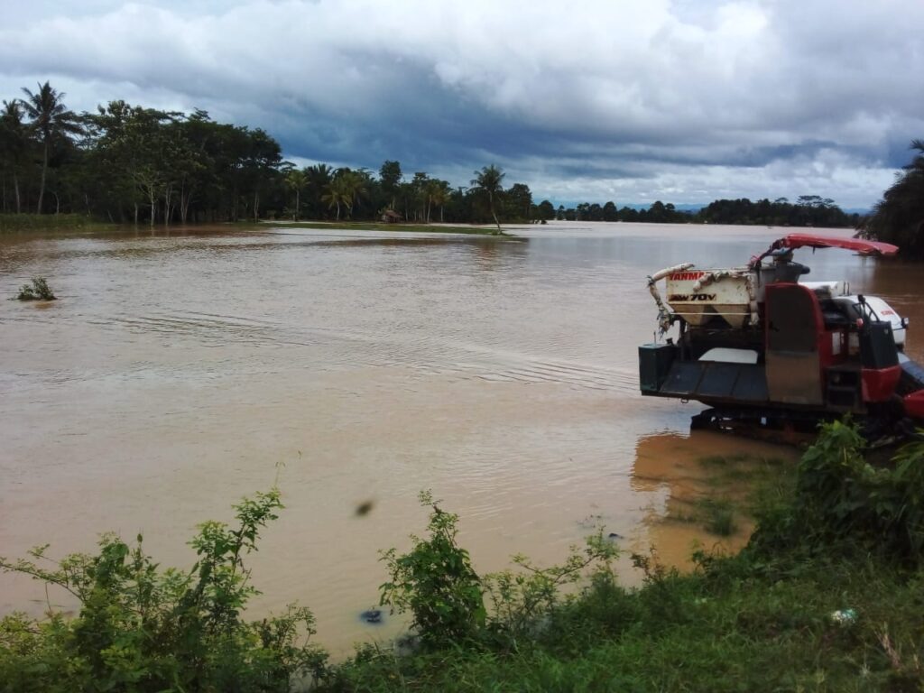 Sehingga air Sungai Cilemer meluap ke permukaan dan membanjiri ratusan hektare sawahan milik warga Desa Sukalangu, Kecamatan Saketi, Kabupaten Pandeglang, Provinsi Banten.