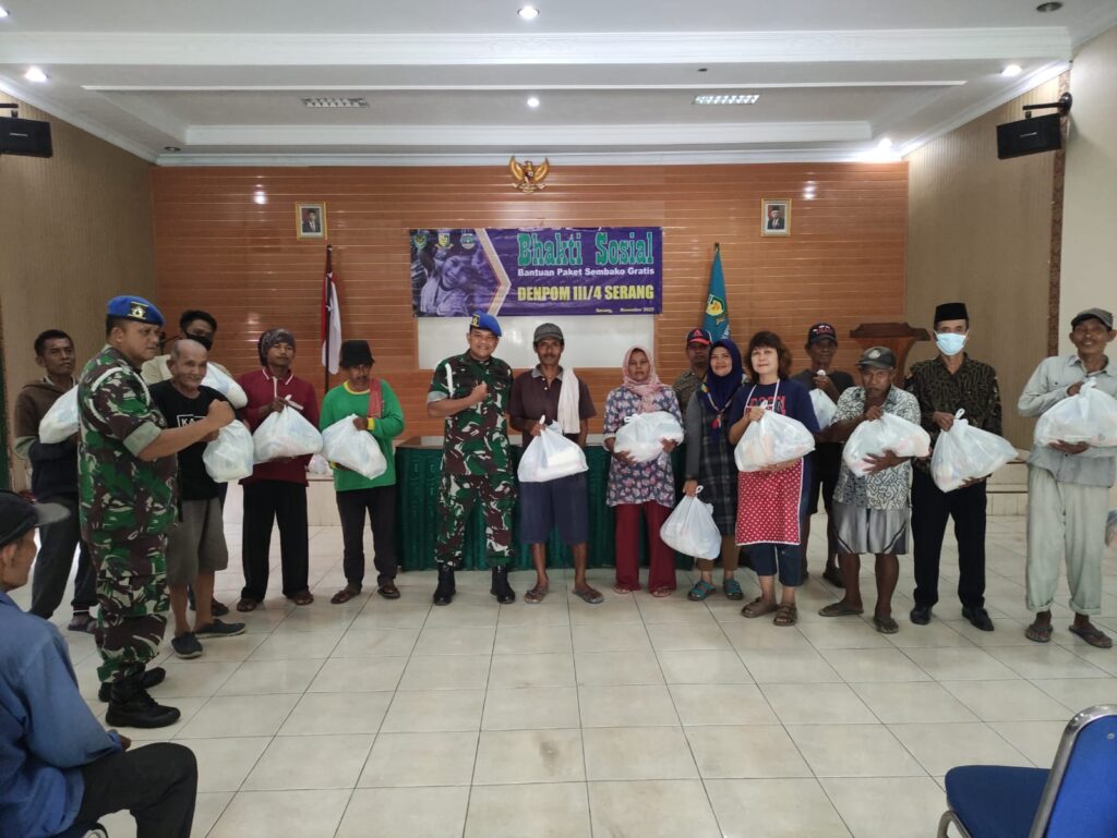 Denpom III/4 Serang melaksanakan Bhakti Sosial (Baksos) berbagai kasih dengan membagikan 150 paket Sembako kepada masyarakat yang kurang mampu yang berada di lingkungan Denpom III/4 Serang, Paket Sembako itu terdiri dari Beras, Minyak Goreng, Gula Pasir, Tepung Terigu, Garam, Kecap, Sarden dan Mie Instan. Kegiatan ini dipimpin langsung oleh Mayor Cpm Obet Santoso (Wadandenpom III/4 Serang) bertempat di Aula Denpom III/4 Serang, pada Rabu. (9/11/2022).