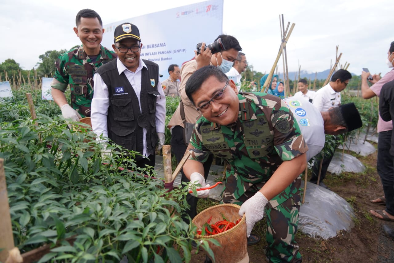 Danrem 064/MY, Brigjen TNI Tatang Subarna menghadiri Gerakan Nasional Pengendalian Inflasi Pangan (GNPIP) di Provinsi Banten dengan melakukan Gerakan Tanam dan Panen Cabai Merah Bersama yang berlangsung di Desa Kadu Kombong, Kecamatan Menes, Kabupaten Pandeglang, pada Rabu (9/11/2022).