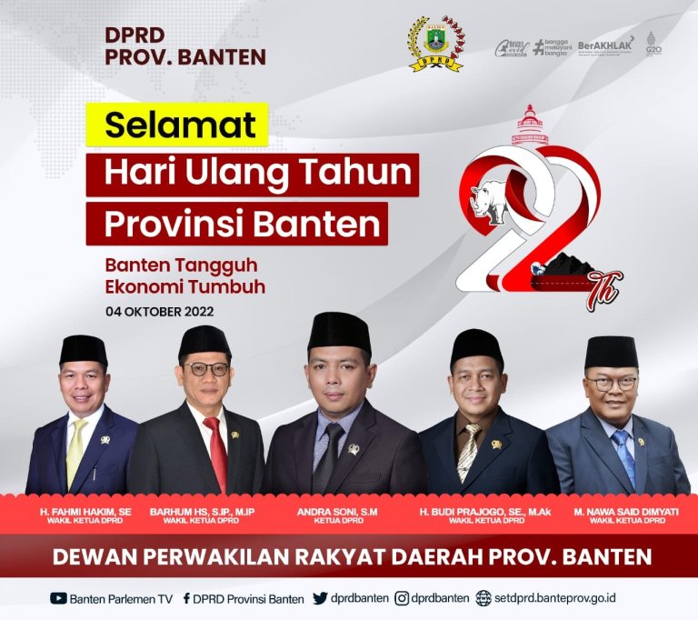 DPRD Provinsi Banten Mengucapkan Selamat Hari Ulang Tahun Provinsi Banten Ke-22 Tanggal 04 Oktober 2022 November 15, 2022November 15, 2022 Redaksi