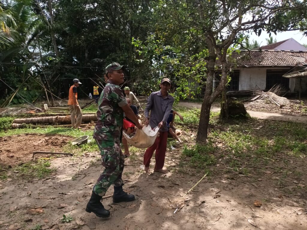 Anggota Koramil 0111/Pagelaran Serda Widagyo melaksanakan kegiatan kerja bakti membantu warga membangun Pos Kamling atau balai ruang warga di Kampung Sawah, Desa Pagelaran, Kecamatan Pagelaran, Kabupaten Pandeglang, Banten, pada Jum’at (02/12/22).
