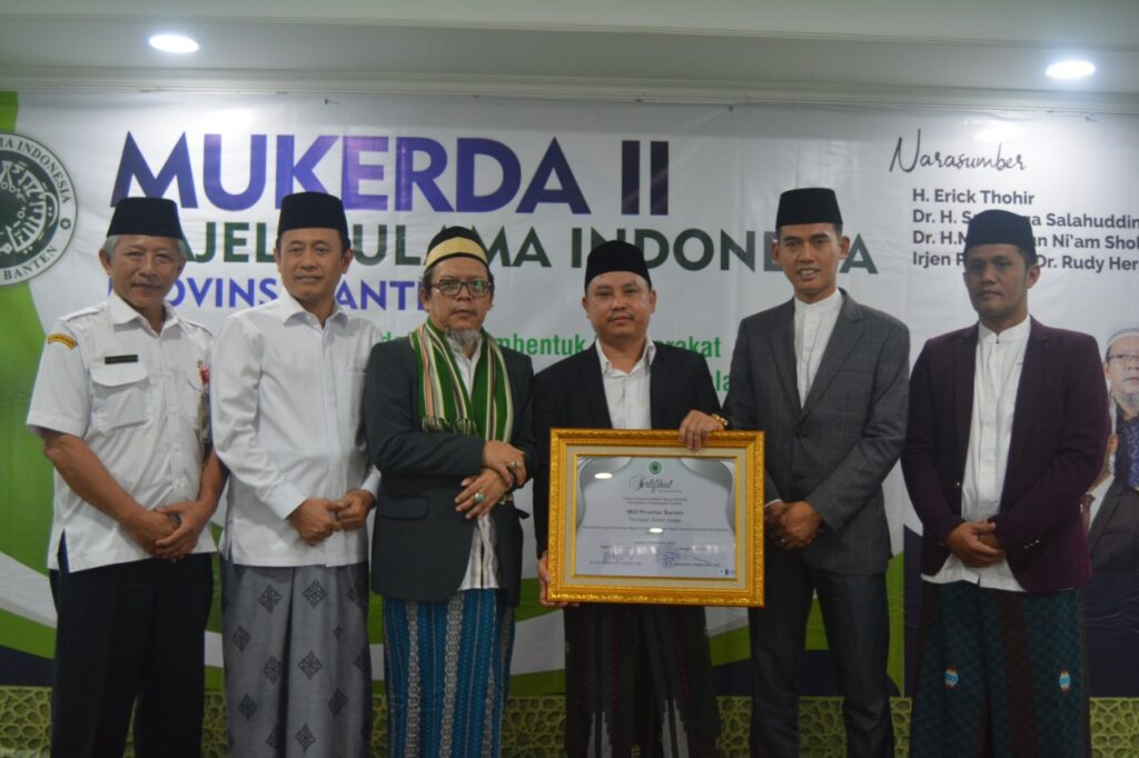 Penyerahan penghargaan dilakukan Ketua Bidang Fatwa MUI Pusat, Dr. KH Asrorun Ni’am Soleh, kepada Sekretaris Umum MUI Banten, Dr. H. Endang Saeful Anwar, Lc. MA