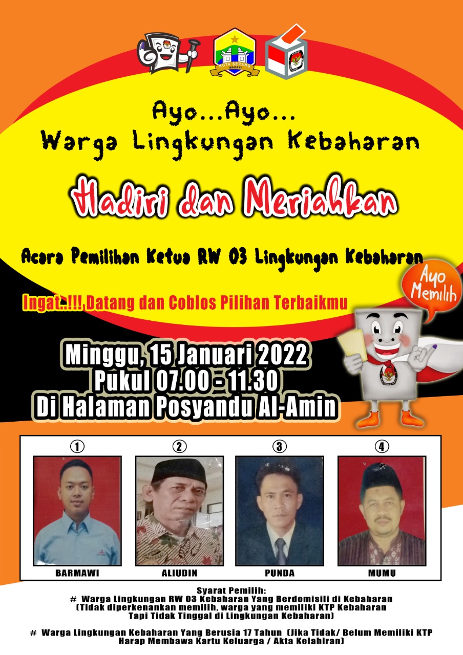 Sementara itu, jumlah hak pilih tercatat sebanyak 1000 orang. Dalam pemilihan Ketua RW.03 di Lingkungan Kebaharan, ada empat kandidat dan nomor urut, antara lain, Barmawi (1), Aliudin (2), Punda (3) dan Mumu (4).