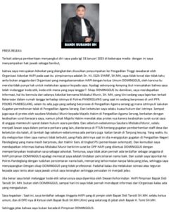 “Press release beredar luas dibuat Sandi Susandi yang diberhentikan oleh organisasi Himpunan Advokad/Pengacara Indonesia (HAPI) isi press releasnya ngawur dan bersifat menyeeang,”  terang Misbakhul Munir, Praktisi Hukum Senior Banten.