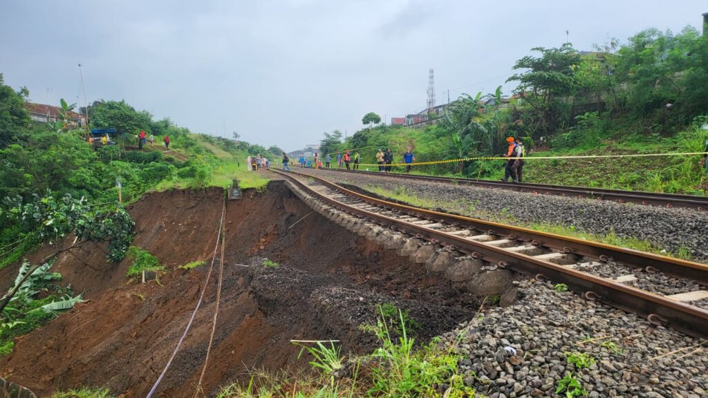 PT. KAI Daop 1 Jakarta Mengucapkan permohonan maaf atas gangguan operasional perjalanan KA Pangrango lintas Bogor – Sukabumi dampak longsor yang terjadi di area jalur rel KM 2+6/7 antara Stasiun Paledang dan Batu Tulis.