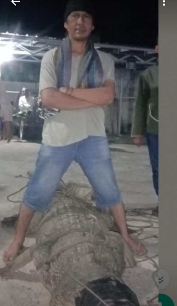 Kepala desa Sumberjaya, Kecamatan Sumur, Kabupaten Pandeglang, Cecep Mulyadi, berfoto di atas buaya yang di tangkap warga, pada Minggu (30/4/2023) kemarin. (Foto : Istinewa).