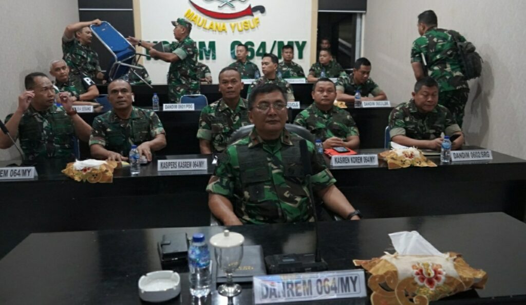 Danrem 064/MY, Brigjen TNI Tatang Subarna bersama Kasrem 064/MY, para Kasi Korem 064/MY, Dandim Jajaran Korem 064/MY dan Kabalak Jajaran Korem 064/MY, mengikuti pengarahan Panglima TNI, Laksamana Yudo Margono, SE., MM, melalui Video Conference, bertempat di Ruang Data Makorem 064/MY Jalan Maulana Yusuf No 9 Kota Serang. pada Senin (1/5/2023).