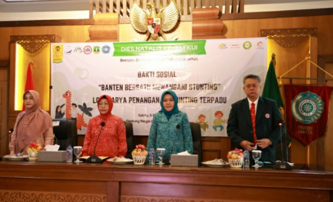 Pemerintah Provinsi (Pemprov) Banten bersama Fakultas Kedokteran Universitas Indonesia (FKUI) menggelar Loka Karya Penanganan Stunting Terpadu. Hal itu dalam rangka upaya percepatan penurunan stunting di Provinsi Banten yang digelar secara langsung dan virtual di Gedung Negara Provinsi Banten, Jln K.H Syam’un No 5, Kota Serang, pada Sabtu (6/5/2023).