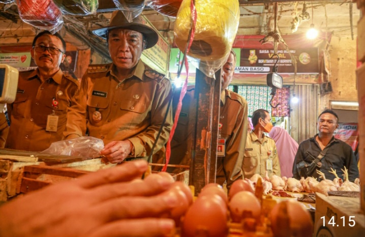 Penjabat (Pj) Gubernur Banten,vAl Muktabar melakukan Inspeksi Mendadak (Sidak) terkait ketersediaan dan keterjangkauan harga bahan kebutuhan pokok, terutama telur ayam ras dan daging ayam ras di Pasar Induk Rau (PIR), Kota Serang, Senin (5/6/2023).