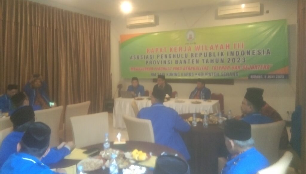 Asosiasi Penghulu Republik Indonesia (APRI) Provinsi Banten, menyelenggarakan Rapat Kerja Wilayah (Rakerwil) III, dengan mengambil tema “Mewujudkan Penghulu yang Berkualitas, Toleran dan Sejahtera”. Kegiatan itu, bertempat di RM. Sari Kuring, Kecamatan Baros, Kabupaten Serang, Banten, pada Kamis (8/6/2023).