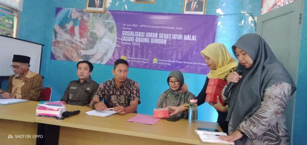 Dinas Ketahanan Pangan Pertanian dan Perikanan Kota Seran,g bekerjasama dengan Dewan Masjid Indonesia (DMI) Kota Serang dan para Ketua DKM mengikuti sosialisasi aman, sehat, utuh dan halal dalam penyembelihan dan pendistribusian Daging Qurban, pada Selasa, 20 Juni 2023, di Balai Penyuluhan Pertanian Cipocok Jaya, Kota Serang.