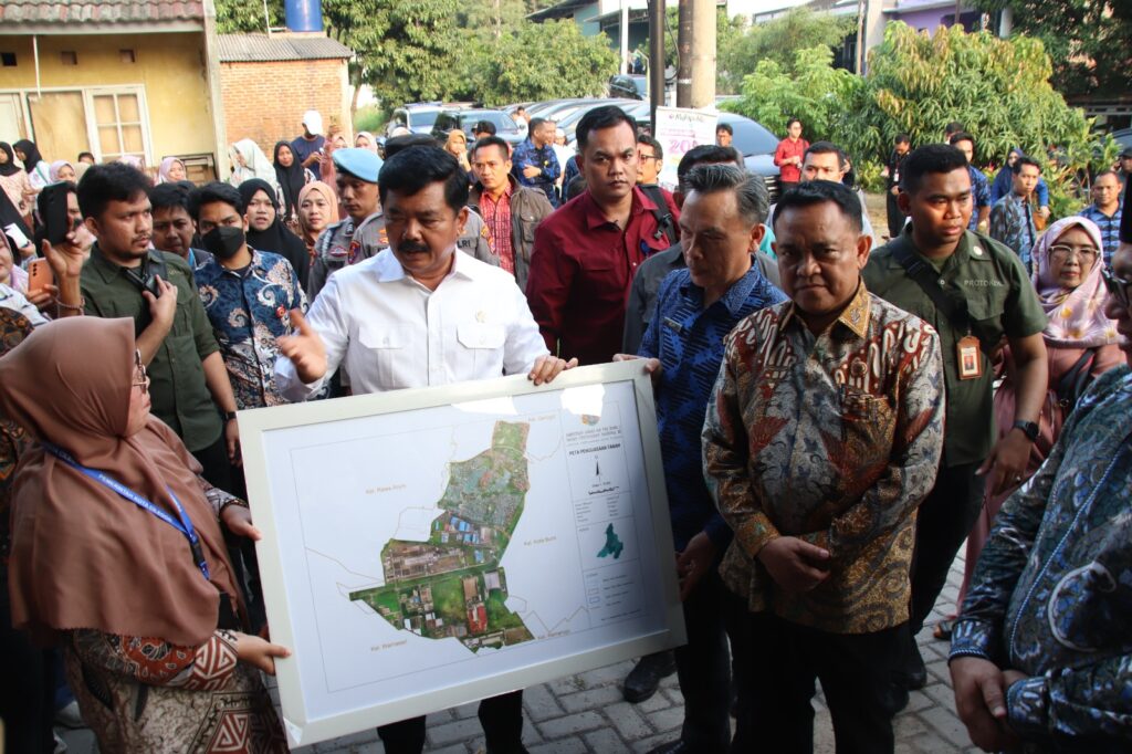 Menteri Agraria dan Tata Ruang/Kepala Badan Pertanahan Nasional, Hadi Tjahjanto, dalam rangkaian kunjungannya ke Provinsi Banten, selain membagikan sertipikat door to door di Kelurahan Kotasari, Kota Cilegon, Banten, juga menyerahkan Peta Tematik Penguasaan Tanah Kelurahan Kotasari kepada Lurah Kotasari, pada Kamis (28/7/2023).