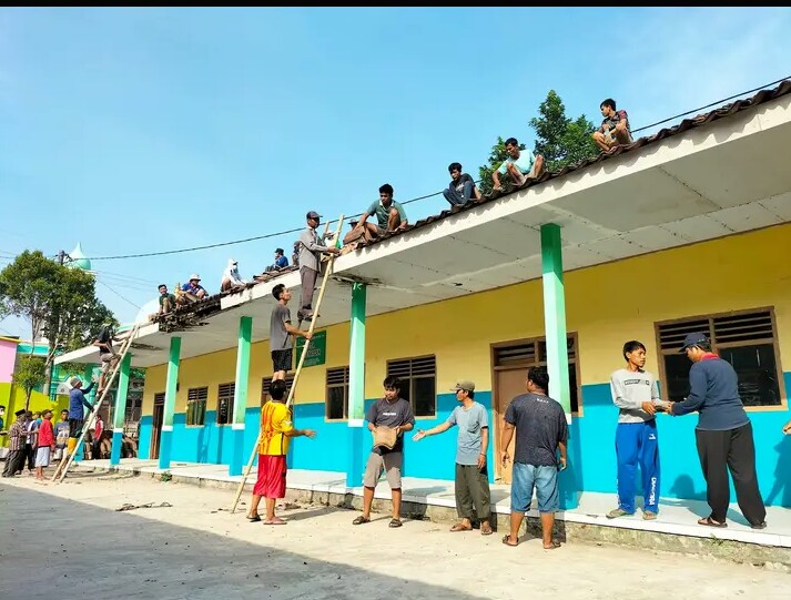 Dalam rangka untuk mencerdaskan siswa Madrasah Diniyah (MD) Darussalam, bersama masyarakat dan para wali murid mengadakan gotong-royong memperbaiki rehab bamgunan sekolah madrasah. di Kampung Pakem, Desa Petir, Kabupaten Serang, Minggu.(13/8/2023). Kegiatan dihadiri epala Sekolah Madrasah Darussalam.