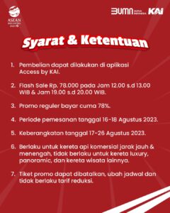 PT. Kereta Api Indonesia (Persero) Daop 1 Jakarta menghadirkan Promo “Satset” (“Saatnya Merdeka dari Macet”) untuk pemesanan tiket dari tanggal 16 s/d 18 Agustus 2023, untuk keberangkatan kereta api tanggal 17 s.d 26 Agustus 2023. Promo tersebut hanya berlaku untuk pembelian melalui aplikasi Access by KAI.