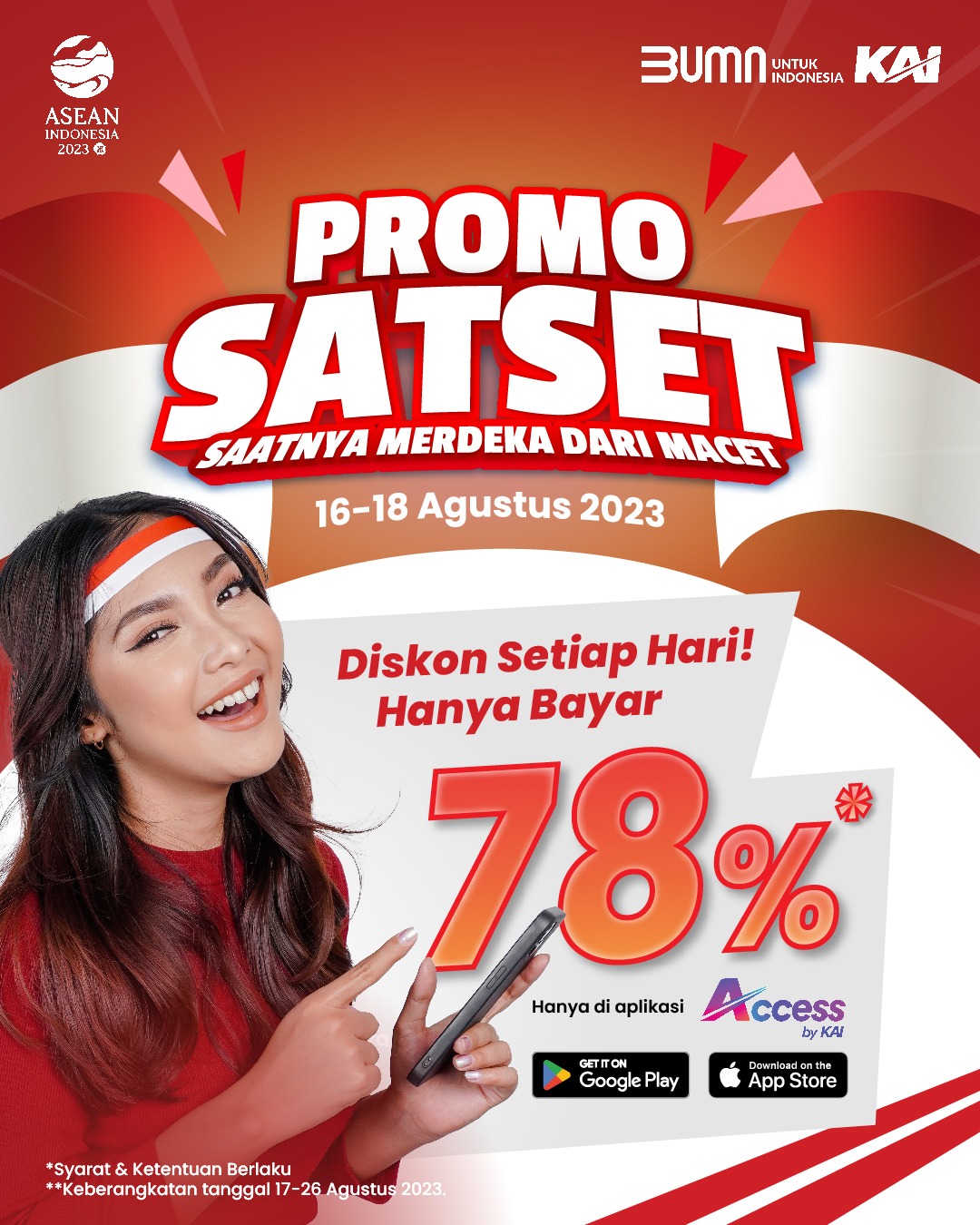 PT. Kereta Api Indonesia (Persero) Daop 1 Jakarta menghadirkan Promo “Satset” (“Saatnya Merdeka dari Macet”) untuk pemesanan tiket dari tanggal 16 s/d 18 Agustus 2023, untuk keberangkatan kereta api tanggal 17 s.d 26 Agustus 2023. Promo tersebut hanya berlaku untuk pembelian melalui aplikasi Access by KAI.