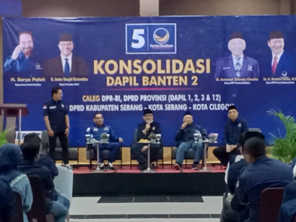 Sememtara itu, rapat konsolidasi Partai Nasdem Provinsi Bamten tersebut dengan mengusung tema “Konsolidasi Dapil Banten 2”. Hadir dalam acara itu antara lain, Calon DPR RI, DPRD Provinsi dari Dapil 1, 2, 3 dan 4. Selain itu juga hadir Calon DPRD Kabupaten Serang, Kota Serang dan Kota Cilegon