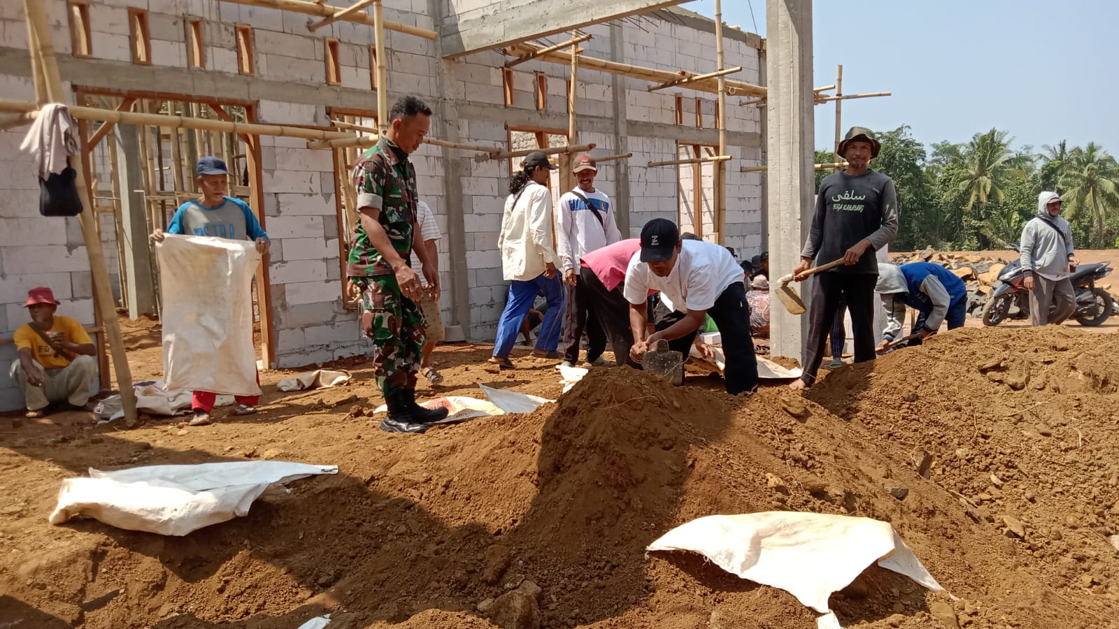 Babinsa Koramil 0114/Cigeulis Kodim 0601/Pandeglang, Serda Yudi melaksanakan kegiatan Kerja bakti gotong royong Pembangunanan Gedung MUI Kecamatan Cigelis bersama masyarakat, Rabu (23/08/23)