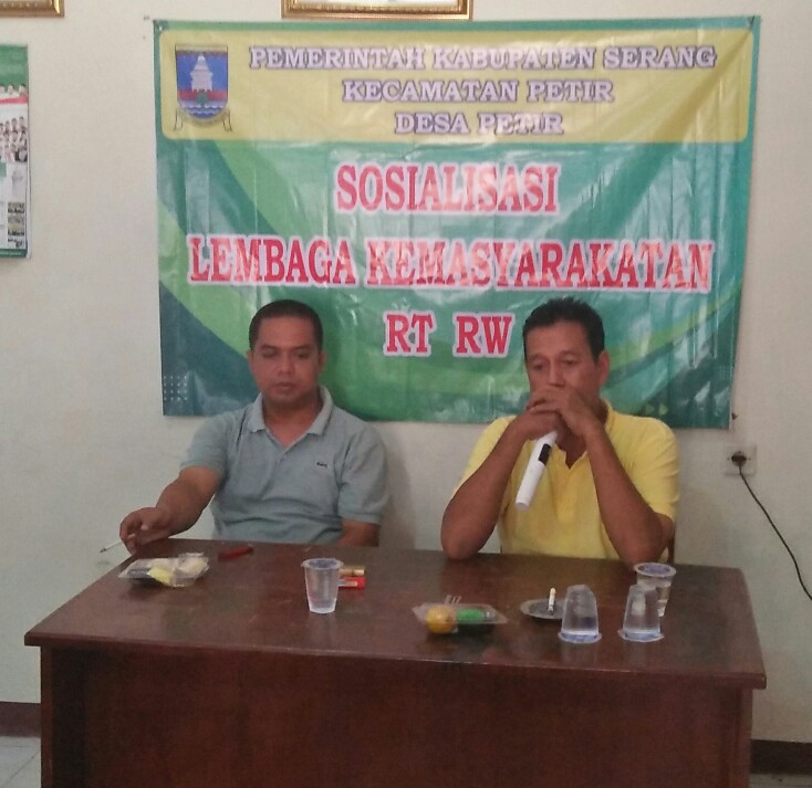 Pemerintah Desa Petir, Kecamatan Petir, Kabupaten Serang, Bamten, mengadakan kegiatan sosialisasi Lembaga Kemasyarakatab RT/RW. Acara itu dihadiri Kepala Desa Petir. Sekretaris Desa Petir. tokoh masyarakat para Ketua RT dan RW.