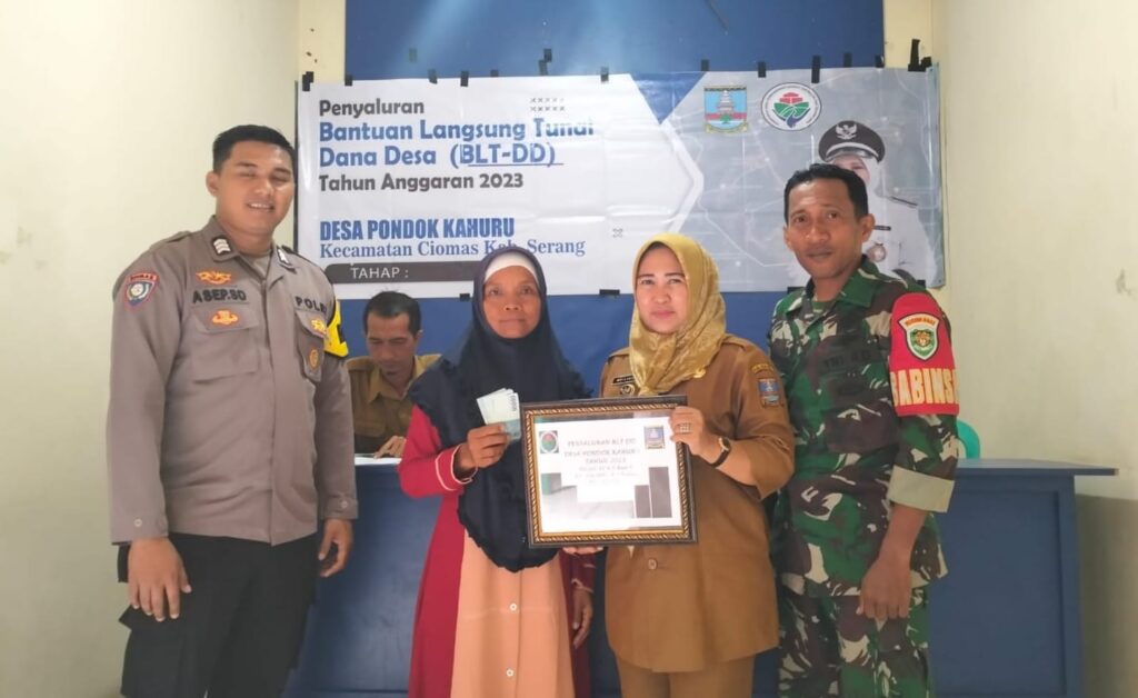 Bintara Pembina Desa (Babinsa) Koramil 0602-12/Ciomas, Kodim 0602/Serang, Sersan Dua (Serda) Imran Pary bersama Bhabinkamtibmas, Bripka Asep, mendampingi Kepala Desa Pondok Kahuru, Meiliana, menyalurkan Bantuan Langsung Tunai Dana Desa (BLT DD) tahap 4, 5 dan 6 Tahun 2023. Kegiatan itu bertempat di Kantor Desa Pondok Kahuru, Kecamatan Ciomas, Kabupaten Serang, Provinsi Banten, pada Rabu (30/09/2023).