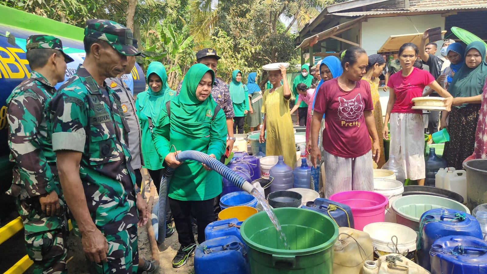 Untuk mengatasi kekeringan akibat dampak fenomena El nIno, Kodim 0602/Serang bersama dengan kawasan Moderen Land menyalurkan air bersih untuk warga yang terdampak kemarau di Desa Tanara Kabupaten Serang Provinsi Banten, Jum’at (08/09/2023).